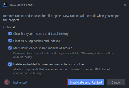 IntelliJ IDEA의 캐시를 정리하는 방법은 [File → invalidate Caches...] 경로에서 'Invalidate and Restart' 버튼을 클릭하면 된다.