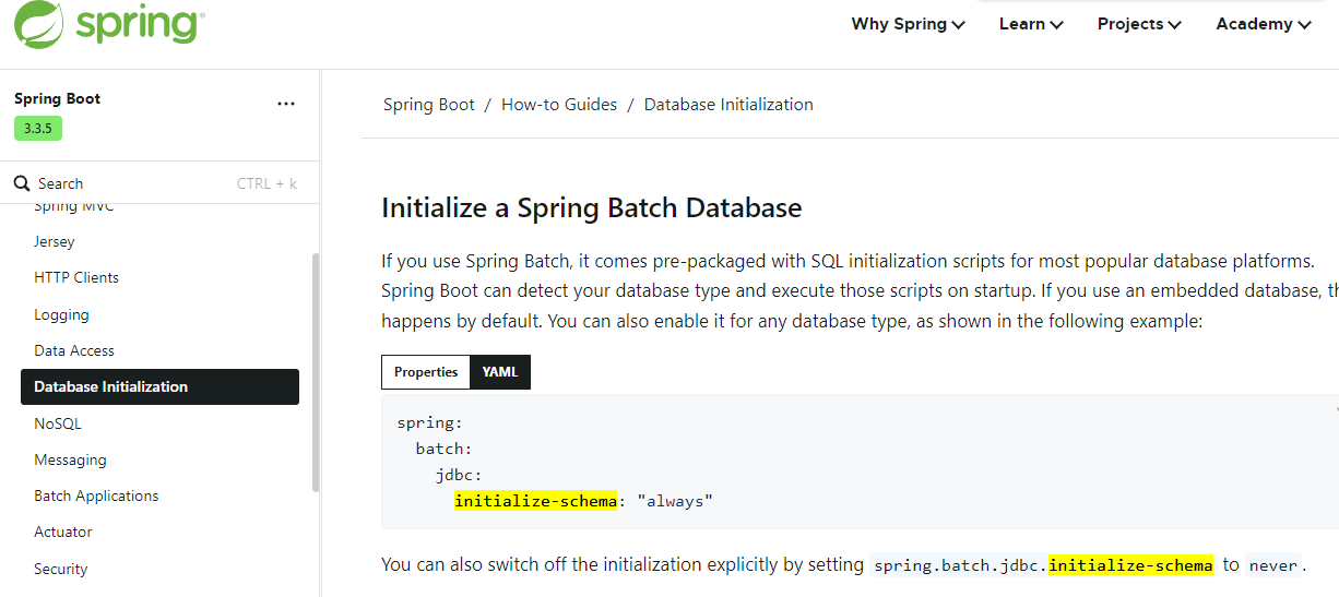 그리고 기본적으로 제공되는 메타 테이블의 초기화 방법에 대해서 커스터마이징할 수 있고, 속성 값으로 '애플리케이션 시작 시 스키마를 항상 초기화' 하도록 'always'로 지정하라는 것이다(참고로 한 번만 실행하거나 이미 있다면 생성하지 않는 속성 값은 없다). 어쨌든 제 경우에는 같은 소스가 개발 환경에만 적용되는 슬픈 현상이 있었지만, 애초에 운영의 배치 실행 이력까지 매번 초기화시키면 데이터 손실이 발생하니 권장되지 않는다. 그래서 한 번만 실행하고 'never'로 수정하여 재배포하거나 애플리케이션 기동 이전에 org/springframework/batch/core 라이브러리 내의 SQL을 직접 실행시키는 방법이 있겠다. 간단한 방법이 있지만 springboot의 스타일로 적용시켜보고 싶어 다른 방법을 찾아봤다.