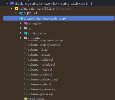 내용을 보면, "스프링 배치를 사용하면 대부분의 데이터베이스에 대한 SQL 초기화 Script를 함께 제공하는데, 스프링부트가 데이터베이스 유형을 감지해서 시작 시 해당 스크립트를 실행한다" 라고 설명돼있다. 이게 무슨 말이냐면, 스프링 배치를 사용하기 위한 관련 Dependency를 추가하면 org.springframework.batch:spring-batch-core 라이브러리가 받아지는데, 이 라이브러리 패키지 내에 스프링 배치가 관리하는 메타 테이블에 대한 초기화용 DDL이 내장돼있다는 말이다.