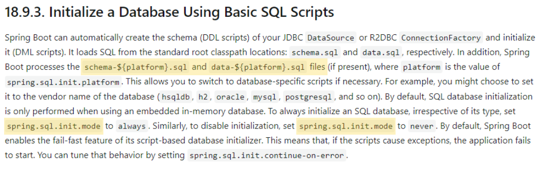 | spring.sql.init.mode | 일반 SQL 스크립트 실행 | 데이터베이스 전체 | 테이블 생성, 기본 데이터 삽입 등 일반 작업 |