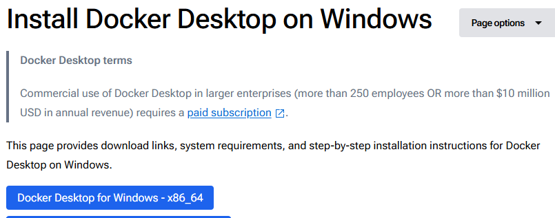 도커 공식 문서 사이트에서 설치 파일을 받도록 하겠습니다. 화면을 조금 스크롤해서 내용을 읽어보면 WSL2 또는 Hyper-V 기반으로 Docker Desktop을 설치할 수 있다고 설명돼있다.