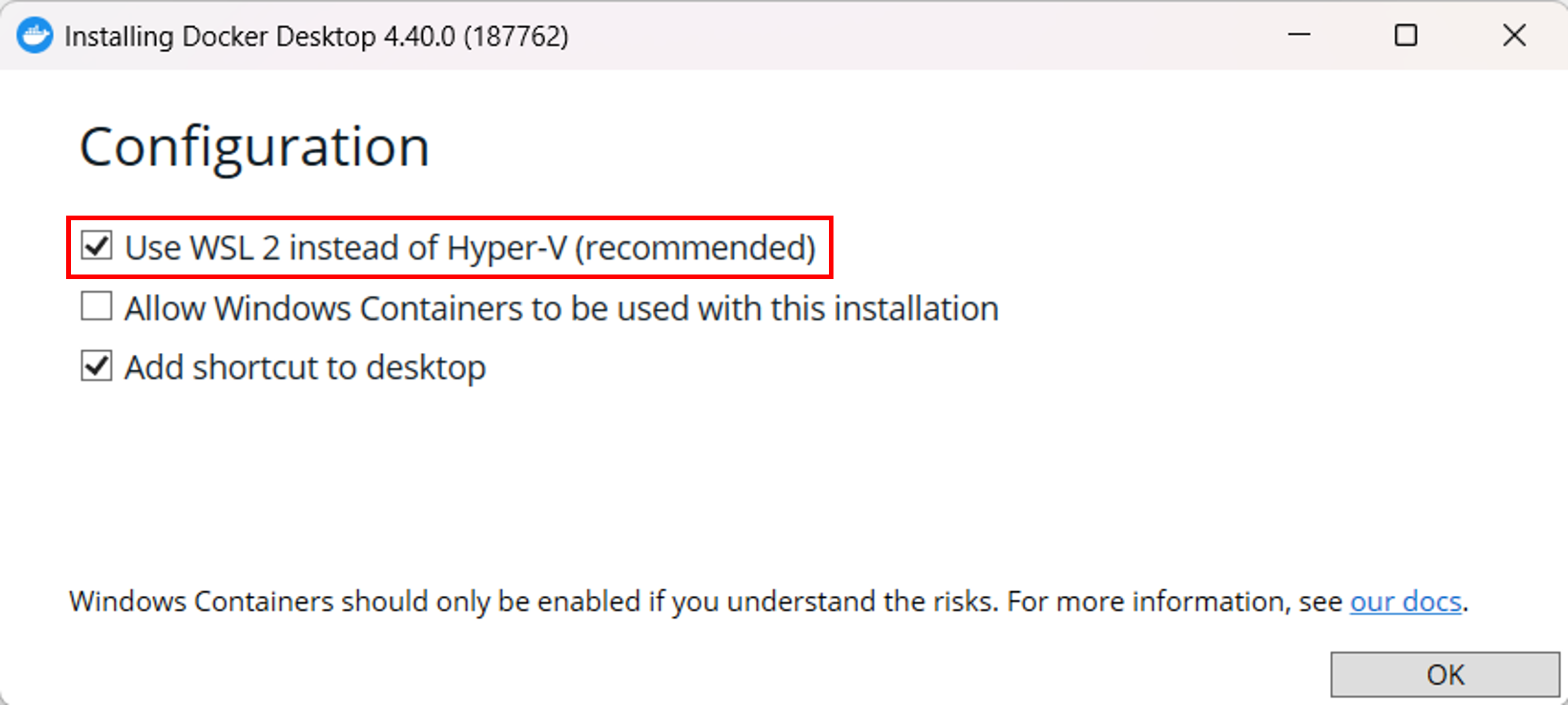 'Use WSL 2 instead of Hyper-V' 항목을 선택한 채로 설치 진행. 만약 이걸 선택하지 않으면 Docker가 리눅스 컨테이너를 실행할 때, Hyper-V 가상 머신 방식을 사용함을 의미한다.