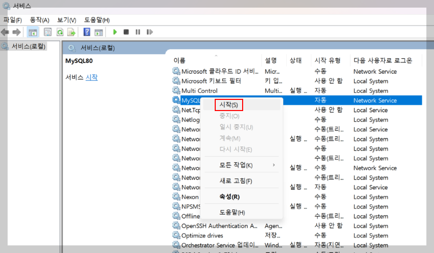 ② mysql을 찾고 서비스 시작 클릭.