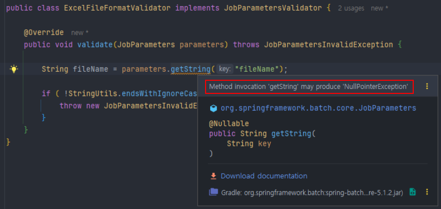 IDE에서 "Method invocation may produce NullPointerException" 경고 메시지를 발견했다. 왜 이런 Warning이 표시되는가?Method invocation '~~~' may produce NullPointerException 경고를 해석해 보면 메서드 호출 시 NullPointerException이 발생할 수 있다는 것을 의미한다.저의 경우엔 getString() 메서드를 호출할 때 paramters 객체가 null일 수도 있다는 말인데.. 사실 위 코드는 Spring에서 제공하는 인터페이스를 활용하는 거라 JobParameters가 null일 수가 없는 코드이기는 했다. IDE가 이런 메시지를 나타내는게 이해가 안 되긴 하지만, 좀 생각해 보니 getStrin..
